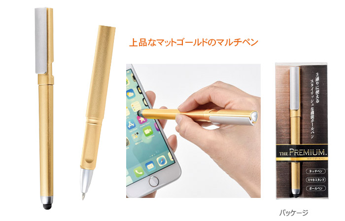 ※商品のみのご注文の場合はメーカーより直送となります。そのため、お支払方法は銀行振り込み、郵便振り込み、クレジットのみとなります。また別途発送手数料が発生します。詳しくは正式お見積りにてご案内させていただきます。上品なゴールドマットのスタイリッシュなマルチペン。ボールペン&タッチペン&スマホホルダーと多機能なペンです。機能的で実用的なので手放せない1本です。ボールペンは記念品や粗品として配ると喜ばれます。卒業記念品、周年記念品や創立記念品、展示会の来場者記念品にぜひご活用ください。