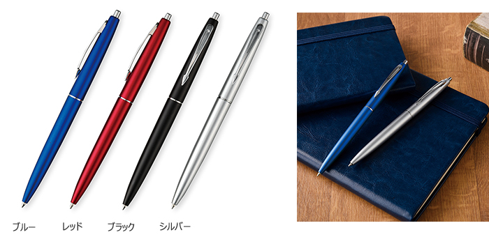 シンプルで飽きの来ないボールペン。メタリック調なので高級感があります。ボールペンは記念品や粗品として配ると喜ばれます。卒業記念品、周年記念品や創立記念品、展示会の来場者記念品にぜひご活用ください。