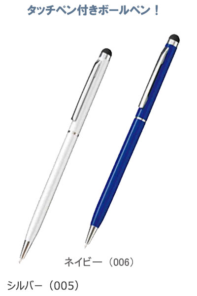 タッチペンが付いているボールペンです。スクリュータイプでさり気なくメモが取れます。手帳用ペンとしての持ち歩きにもおススメです。ネイビー、シルバーから選択が可能です。ボールペンは記念品や粗品として配ると喜ばれます。卒業記念品、周年記念品や創立記念品、展示会の来場者記念品にぜひご活用ください。