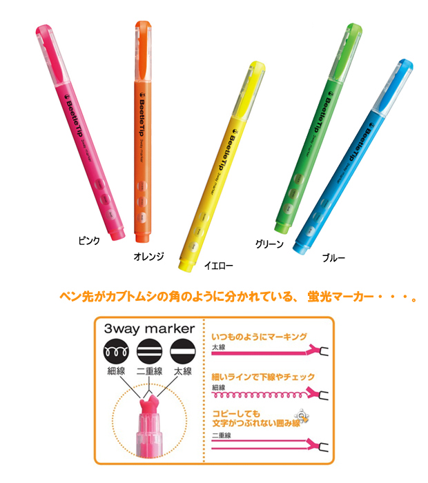 カブトムシの角のようなペン先に秘密がある蛍光ペン。太線、細線、二重線と3種類の線を1本で引ける、優秀なアイテムです。カラーはピンク、イエロー、オレンジ、ライトグリーン、ライトブルーから選べます。材質/軸、キャップ:PP、尾栓:R-PP、クリップ:R-ABS。水性顔料蛍光インク(OA用紙対応)。通期仕様キャップ。ギフト用ボックスをご希望の場合は別途料金にてご用意いたしますのでお問い合わせください。蛍光ペンはキネンヒン卒業記念品、周年記念品や創立記念品、展示会の来場者記念品にぜひご活用ください。※この商品はメーカーの希望により販売価格が上代表示になっております。正式お見積りにてお値引を致しますのでご依頼をお待ちしております。名入れをご希望の場合は別途お見積り致しますので、お問い合わせください。
